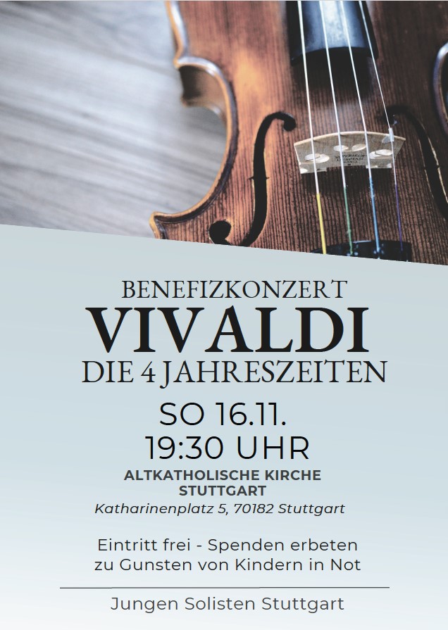 Herzliche Einladung zum Benefizkonzert der Jungen Solisten Stuttgart am Sonntag, 16.11. um 19.30 Uhr. Sie spielen Vivaldis „Die 4 Jahreszeiten“. Der Eintritt ist frei – Spenden werden erbeten zu Gunsten von Kindern in Not.Ort: Katharinenplatz 5, 70182 Stuttgart